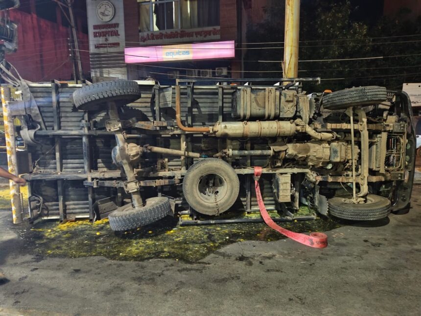 फ्लाईओवर पर अंडों से भरी पिकअप पलटी, फूटे अंडों पर फिसल कर गिरते नजर आए राहगीर…