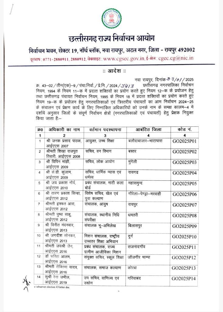 रायपुर। राज्य निर्वाचन आयोग ने छत्तीसगढ़ में होने वाले नगरीय निकाय और त्रिस्तरीय पंचायत चुनाव के संचालन के लिए अलग-अलग जिलों में प्रेक्षको की नियुक्ति की है। बता दें कि छत्तीसगढ़ में नगरीय निकाय चुनाव के लिए नामांकन प्रक्रिया 22 से 28 जनवरी तक चलेगी. नाम वापसी की अंतिम तिथि 31 जनवरी है।
