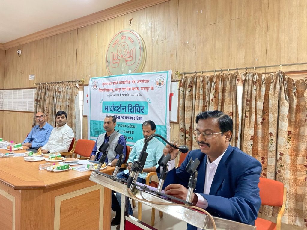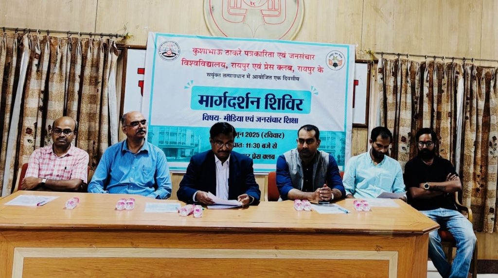 रायपुर 8 जून 2025/ कुशाभाऊ ठाकरे पत्रकारिता एवं जनसंचार विश्वविद्यालय और प्रेस क्लब, रायपुर के संयुक्त तत्वावधान में रविवार को प्रेस क्लब परिसर में एक दिवसीय “मार्गदर्शन (काउंसलिंग) शिविर” का आयोजन किया गया। यह शिविर मीडिया शिक्षा और जनसंचार क्षेत्र में करियर की संभावनाओं को लेकर युवाओं और अभिभावकों को जागरूक करने के उद्देश्य से आयोजित किया गया था।