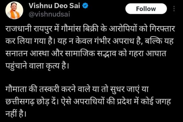 रायपुर। राजधानी रायपुर में बड़ी मात्रा में गौमांस पकड़े जाने पर मुख्यमंत्री विष्णुदेव साय ने तीखे तेवर दिखाये हैं। सोशल मीडिया पर अपनी कड़ी प्रतिक्रिया देते हुए मुख्यमंत्री ने कहा है कि गौमाता की तस्करी करने वाले या तो सुधर जायें या फिर छत्तीसगढ़ छोड़ दें। मुख्यमंत्री ने दो टूक कहा है कि ऐसे अपराधियों…