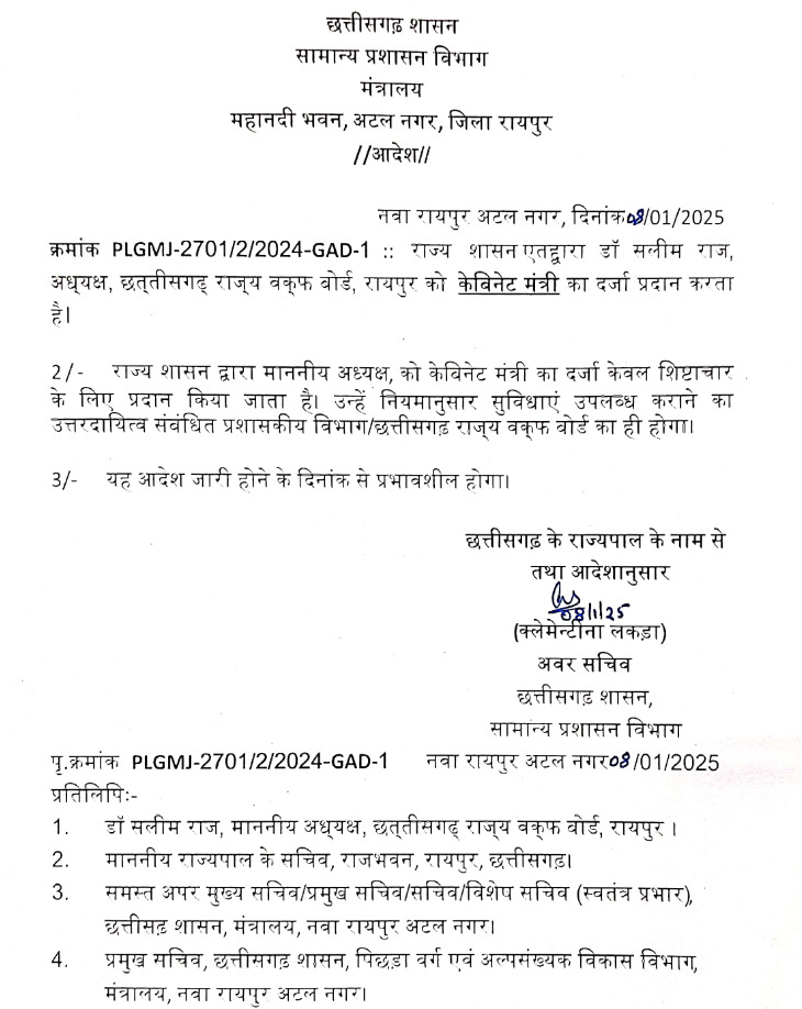 हालांकि ये आदेश में उल्लेख है कि अध्यक्ष को कैबिनेट मंत्री का दर्जा सिर्फ शिष्टाचार के लिए प्रदान किया जाता है। उन्हें नियमानुसार सुविधाएं प्रदान करने की जिम्मेदारी प्रशासकीय विभाग, छत्तीसगढ़ राज्य वक्फ बोर्ड का ही होगा।