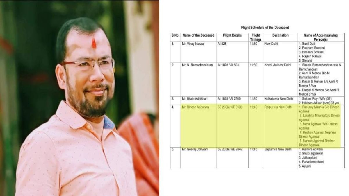 दिनेश मिरानिया (अग्रवाल) का शव दोपहर 11.45 बजे श्रीनगर से फ्लाइट 6E 2356/ 6E 5138 श्रीनगर से नई दिल्ली लाया जाएगा। शव के साथ दिवंगत की पत्नी नेहा मिरानिया, बेटा शौर्य, बेटी लक्षिता, भाई नरेश अग्रवाल और भतीजा केशव अग्रवाल विमान से रायपुर आएंगे।