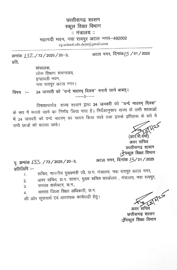 रायपुर। स्कूलों में 24 जनवरी को वंदे मातरम दिवस मनाया जायेगा। इस संदर्भ में स्कूल शिक्षा विभाग की तरफ से डीपीआई को आदेश जारी कर दिया गया है। आदेश के मुताबिक 24 जनवरी को वंदे मातरम दिवस मनाने का निर्णय लिया गया है।